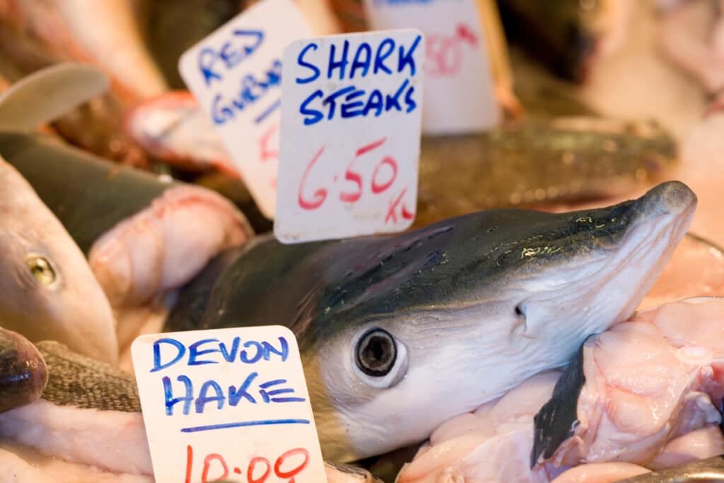 For example, in 2025, a University of North Carolina at Chapel Hill study uncovered that critically endangered sharks, such as the great hammerhead and the scalloped hammerhead, are sold in U.S. grocery stores, seafood markets, and online stores under a vague label of “shark.” [7] [8] Similarly, mako sharks, which are frequently caught as bycatch in tuna fisheries, are often sold as “swordfish” due to similarities in their meat texture and color. It should be noted that mako sharks are listed in CITES Appendix II due to their endangered status and therefore trade of their meat should be strictly regulated. A separate study by the University of Exeter in the UK found in 2019 that fish and chip shops were selling spiny dogfish, a shark species classified as endangered in Europe, under generic names such as huss, rock, flake and rock salmon. [9] In all cases, incorrect, vague, and colloquial labeling of shark meat limited consumer insight into what they were eating and how it got to their plates.